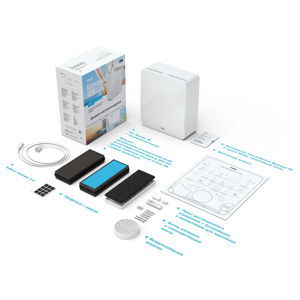 Бризер Tion 4S Family. Комплектация c тонкой очисткой воздуха H13 (очистка и уничтожение вирусов и бактерий на фильтре) и угольным фильтром АК-4S