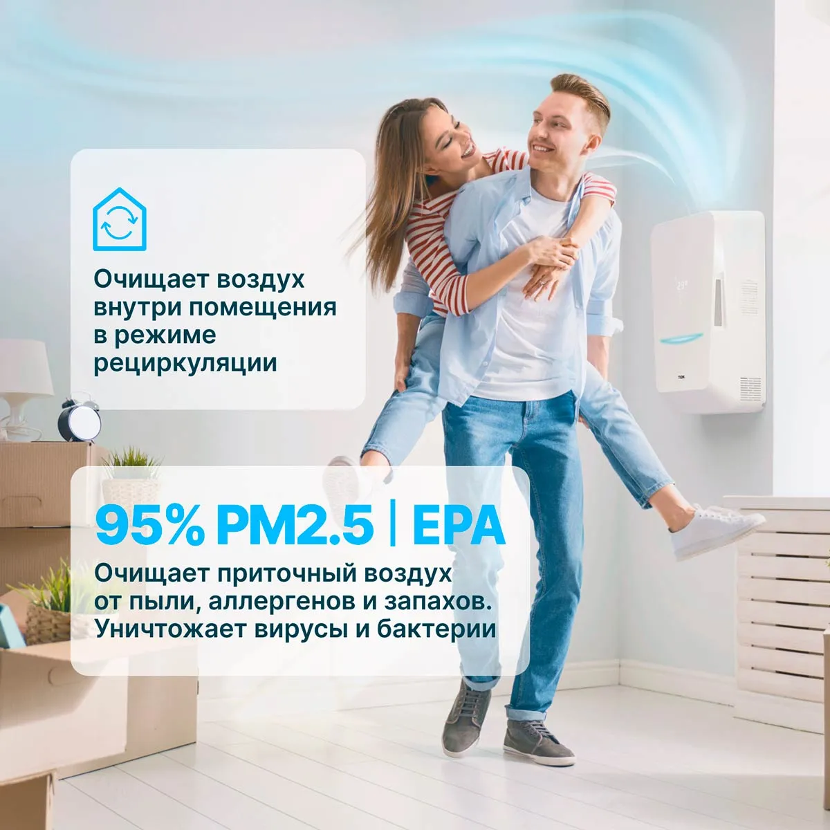Устройство забирает воздух с улицы, подогревает, пропускает через систему фильтров грубой и тонкой очистки, освобождая от загрязнений, пыли, тонкодисперсных частиц PM2.5, сажи, тополиного пуха, пыльцы, спор плесени. Уничтожает вирусы и бактерии на фильтре класса EPA. В помещение поступает чистый свежий воздух комфортной температуры, а в режиме рециркуляции бризер эффективно очистит воздух внутри вашего дома или офиса.