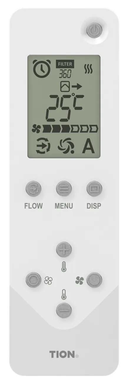 Пульт предназначен для удаленного управления бризерами Tion 3S, 4S, Lite в режиме ручного управления. С его помощью можно регулировать температуру подогрева воздуха, скорость потока воздуха, а также настроить таймер включения и выключения устройства. ЖК-дисплей показывает, сколько дней осталось до замены фильтров.